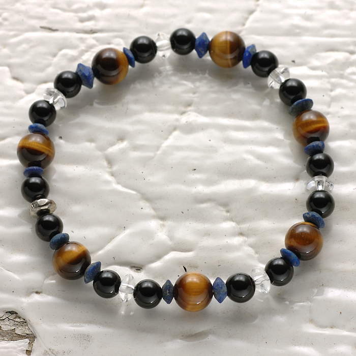 タイガーアイ、オニキス、ラピス、水晶を使ったブレスレット。