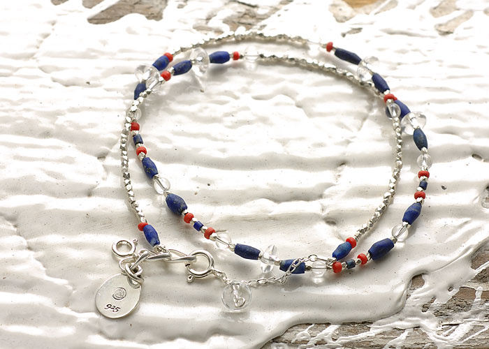 シルバービーズにラピス、コーラル、水晶を組み合わせた2重巻きブレスレット。