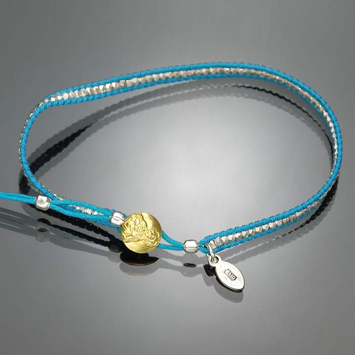 ブルーのコットンコードに小さなシルバービーズを一つ一つ手作業で編みこみ、ゴールドコーティングを施したシルバー製のジーザスメダイコンチョとシルバー製のチャームがポイントになった、気の遠くなるような作業工程をへて制作された細身で可愛らしい男女兼用のシングルブレスレット。