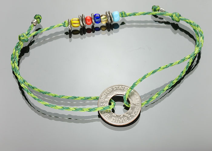 グリーンのワックスコードを編み込んで、繰り抜いた10セントコインには「AMP」の刻印が打ち込まれており、反対側にはクリスマスビーズがランダムに配置されているので、2種類の見え方が楽しめます。