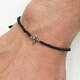 手編みによる黒いロウ引きしたワックスコードに、クロスチャームと、真鍮製のブランドチャームを組み合わせたブレスレット。