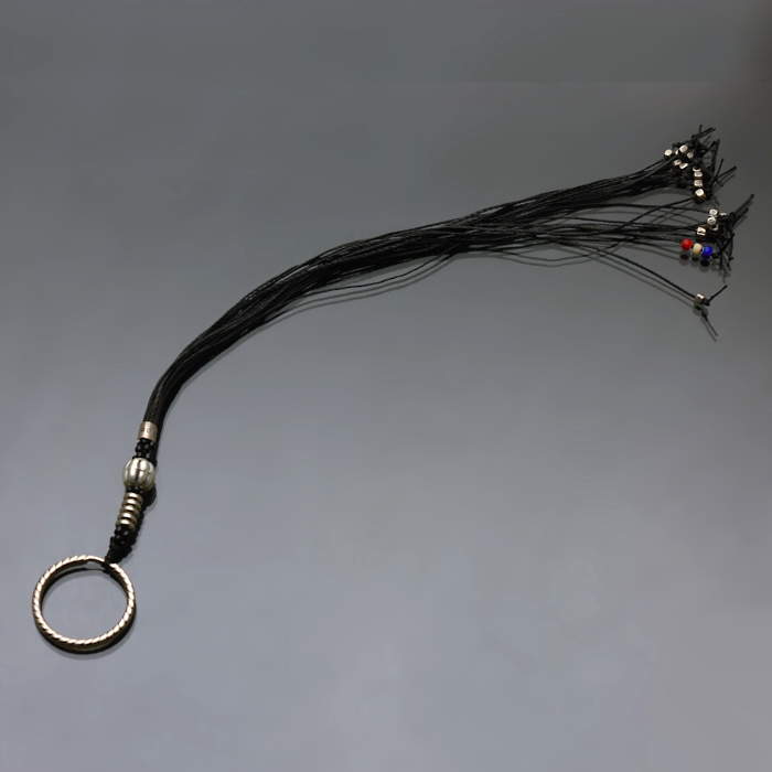 ロウ引きした黒のワックスコードにブラス、カッパー、グラスビーズを編み込んだキーホルダー。