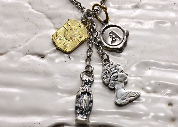 くりぬきのエリザベス、マリア、クレストをたらしたネックレスにアルファベットチャームをプラス。