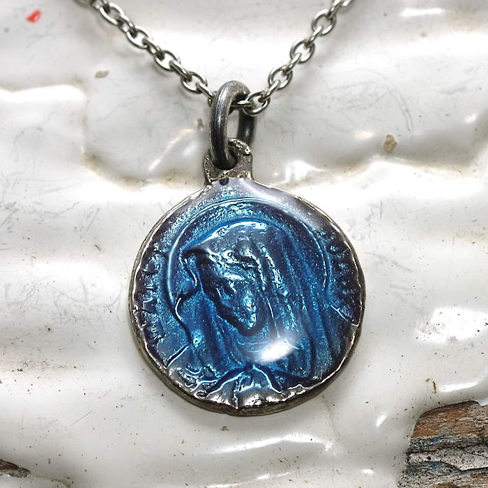 コインのマリアにはブルーのエポキシ樹脂をコーティングしたキレイなアイテム。