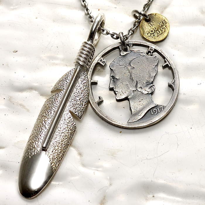 アメリカ合衆国のコインの中で最も美しいとされるウィングド リバティ ヘッド コイン(マーキュリー ダイム)に、スモールサイズのフェザーをセットしたネックレス。
