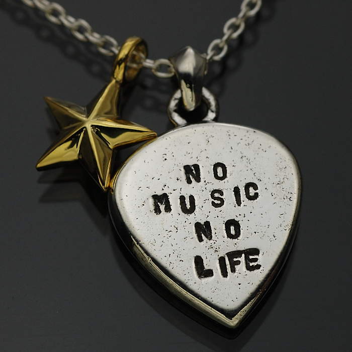'’NO MUSIC NO LIFE’'(音楽の無い人生なんてあり得ない)をシルバー925製のピックスタイルトップに打ち込みました。