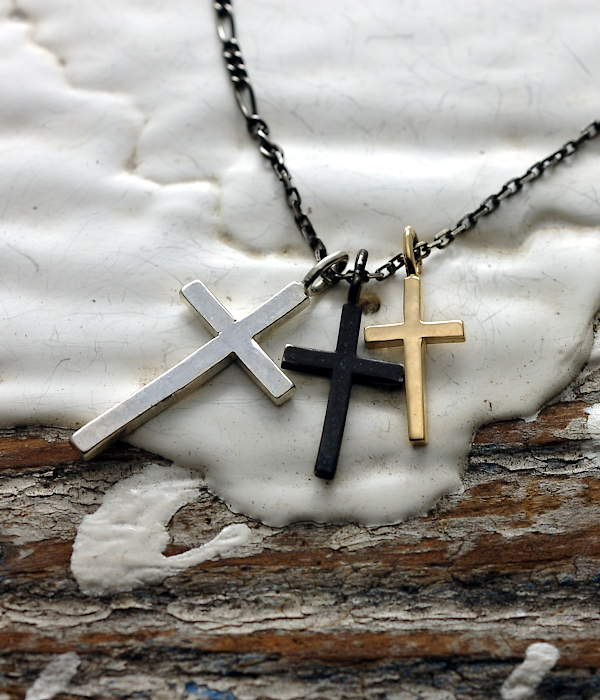 ハンドカットされ叩かれ仕上げられた、温かみ感じられる手作りのシルバー925製の25mmクロスと、黒く燻した18mmクロス、10金イエローゴールド製の17mmクロスのトリプル トップ ネックレス