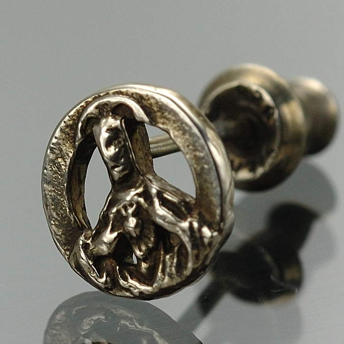 ジーザスメダイをピースマークにカットして、いぶし加工を施したシルバー製ピアス。