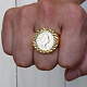 ダイヤモンドカットを施し、K18ゴールドコーティングした印台に、エリザベスコインを裏から爪留めしたリング。