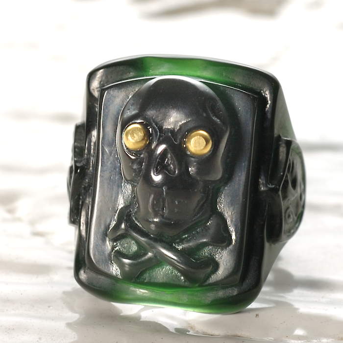 スカルの目に真鍮素材のチップを施している、どことなく愛嬌がある逸品。