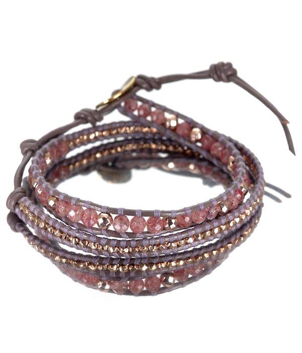 ストロベリークウォーツとインディアンビーズをレザーにあしらった2連ラップブレスレット。