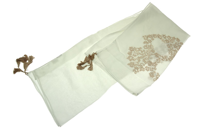 淡いベージュにベージュ系のリボンタッセルをあしらい、生地をスカル柄に縫い込んだ2非常に手の込んだ、肌に優しく軽い中判のストール。