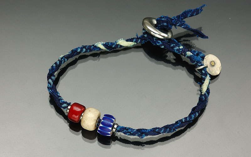西アフリカの生地を細く裂いた後に編み上げロープにし、シェブロンビーズ、トーレードビーズを編み込んだブレスレット。