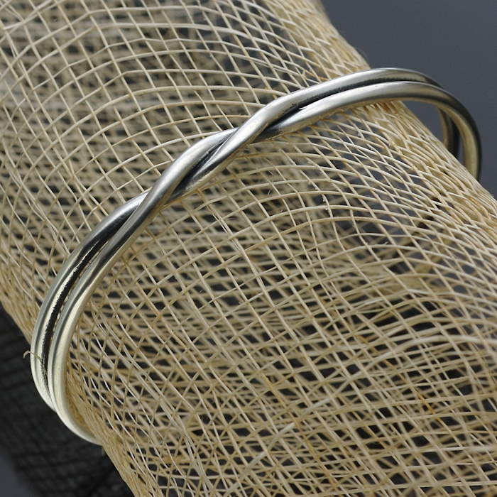 中央部分でツイストさせることでシンプルの中にもデザイン性も高く、個性的なバングルですが着用しやすく、他のリングやブレスレットとも合わせやすいアイテムです。