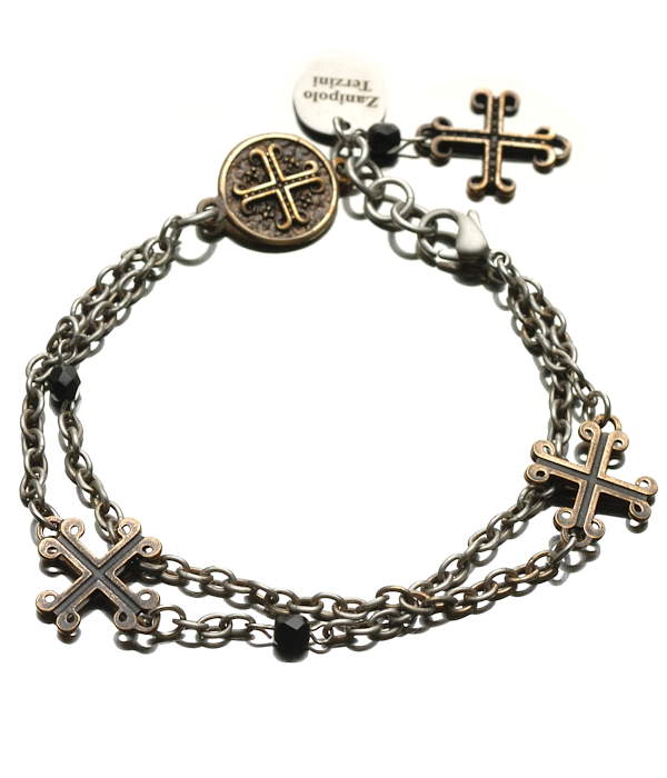 2連のチェーンに3つのクロスチャームとクロスコインチャーム、3つのブラックスピネルをバランス良く配置しているチェーンブレスレット