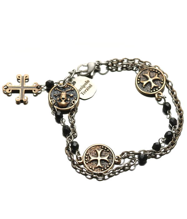 2連のチェーンに2つのクロスコインチャームとスカルコインチャーム、9つのブラックスピネル、クロスチャームをバランス良く配置しているチェーンブレスレット